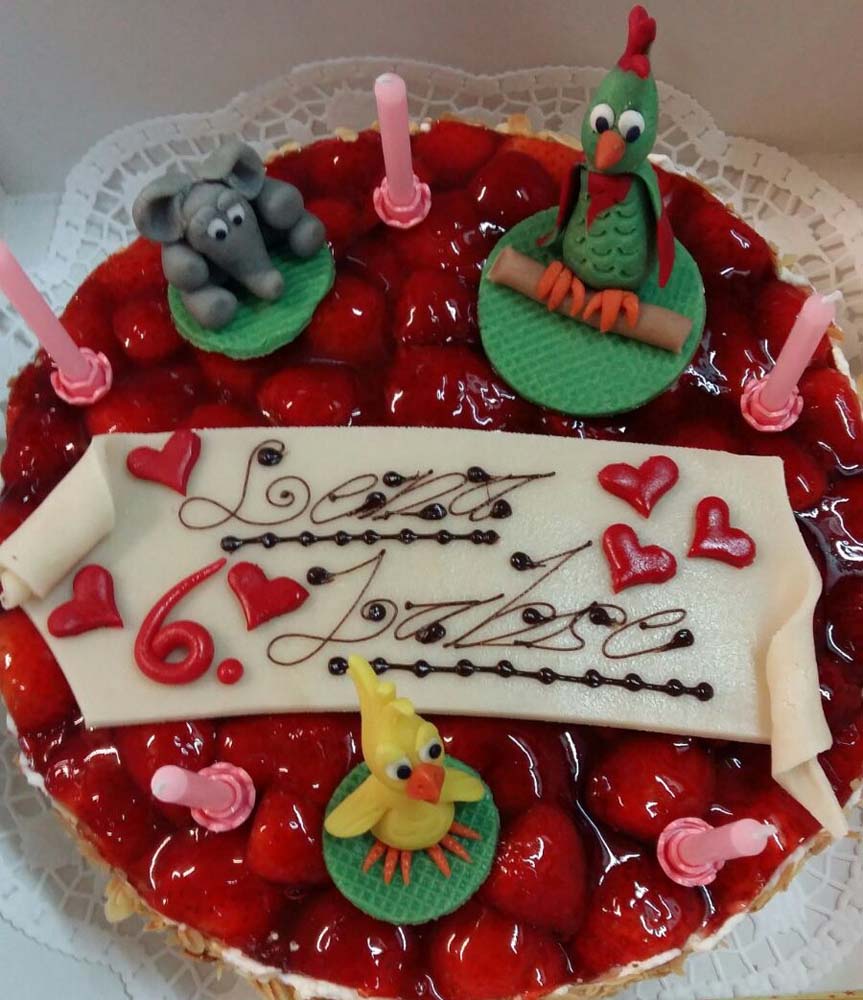 Alle unsere Torten werden in mühevoller Handarbeit täglich frisch produziert. Die dafür benötigten Zutaten stammen größtenteils aus der Region und werden nach altüberlieferten Rezepten verarbeitet. Dabei darf natürlich auch eine passende Verzierung nicht fehlen. Abgerundet wird das Meisterwerk mit der gewünschten Anzahl an Kerzen, als Symbol für das erreichte Lebensalter des Geburtstagskindes.